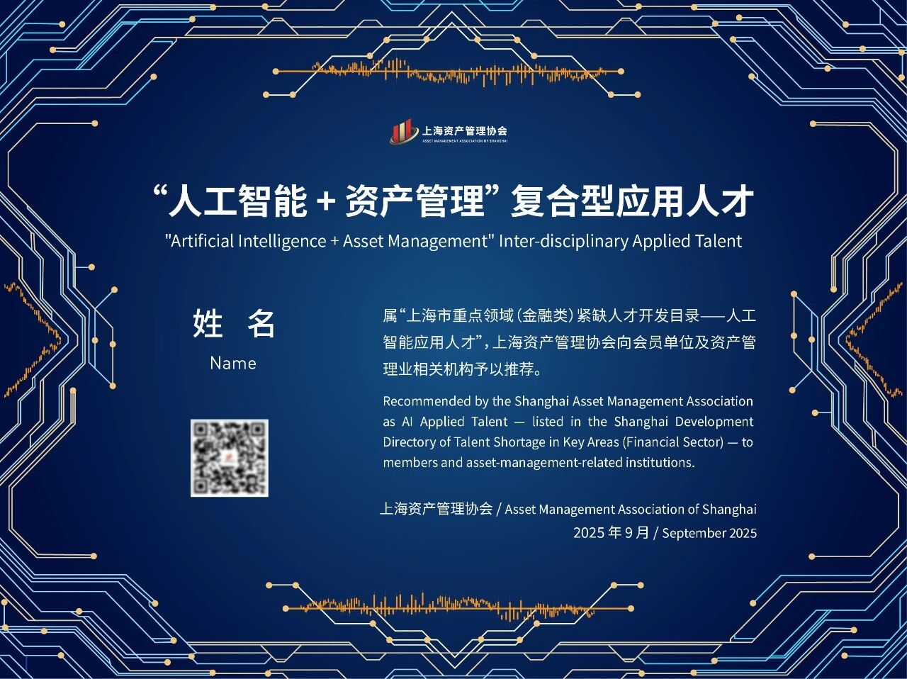 上证报中国证券网讯(记者 聂林浩)9月8日,上海资产管理协会协会(以下简称“协会”)公布了第一批次“人工智能+资产管理”(AIAM)复合型应用人才(简称“AIAM人才”,属上海市重点领域金融类“十四五”紧缺人才开发目录——人工智能应用人才)。