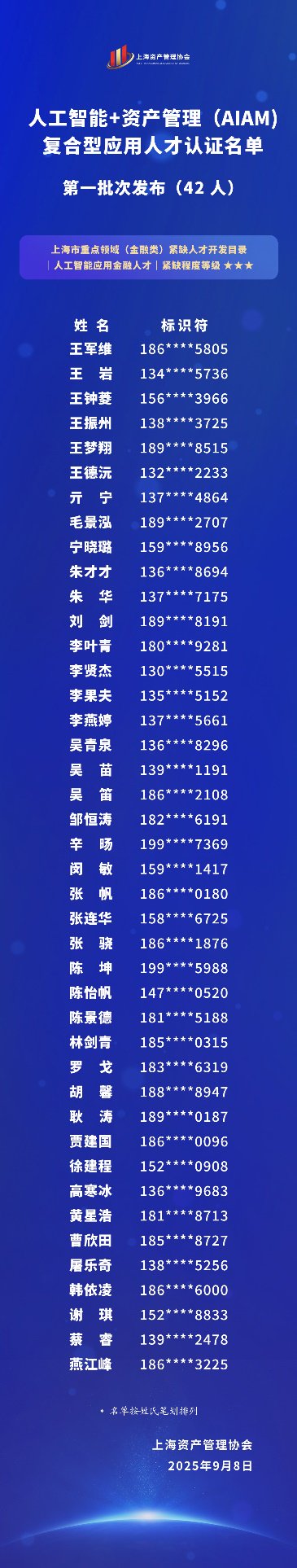 经AIAM人才集训和个人情况核实,9月8日,协会发布第一批次(42名)AIAM人才认证。