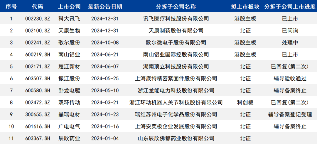 据统计,2024年内更新分拆进度(且尚未终止)的A股公司有11家。