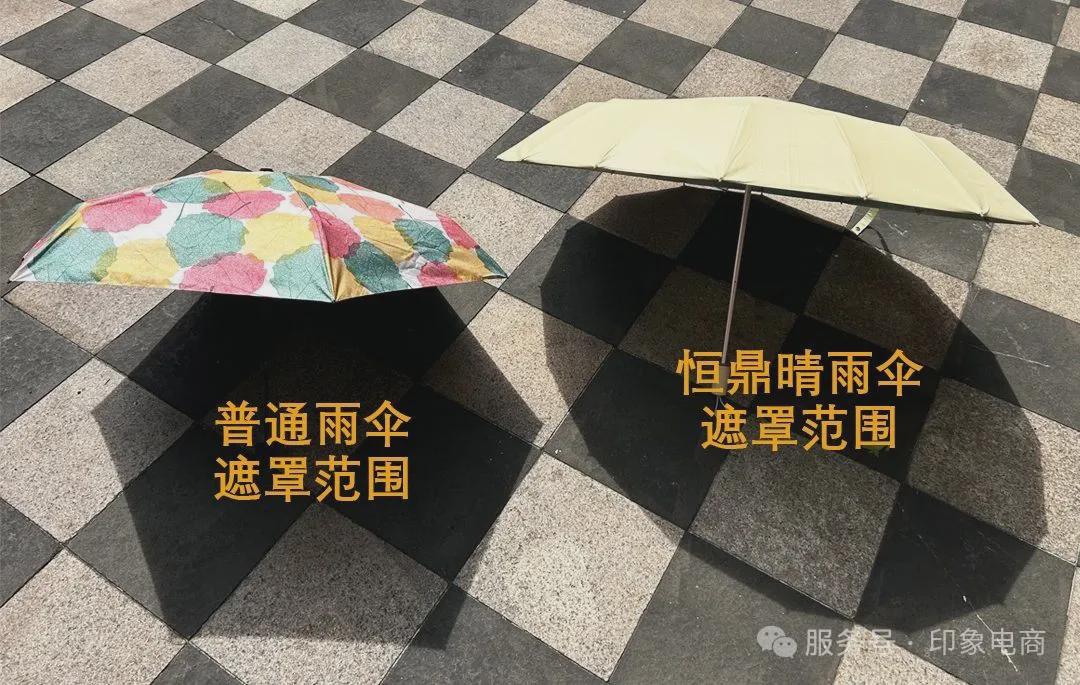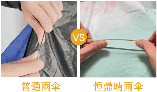 (2)普通伞最多用的是黑胶,而恒鼎伞用的可是成本更贵,防晒降温效果更好的彩胶涂层,所以,它的防晒指数UPF50+,紫外线格挡99.95%。