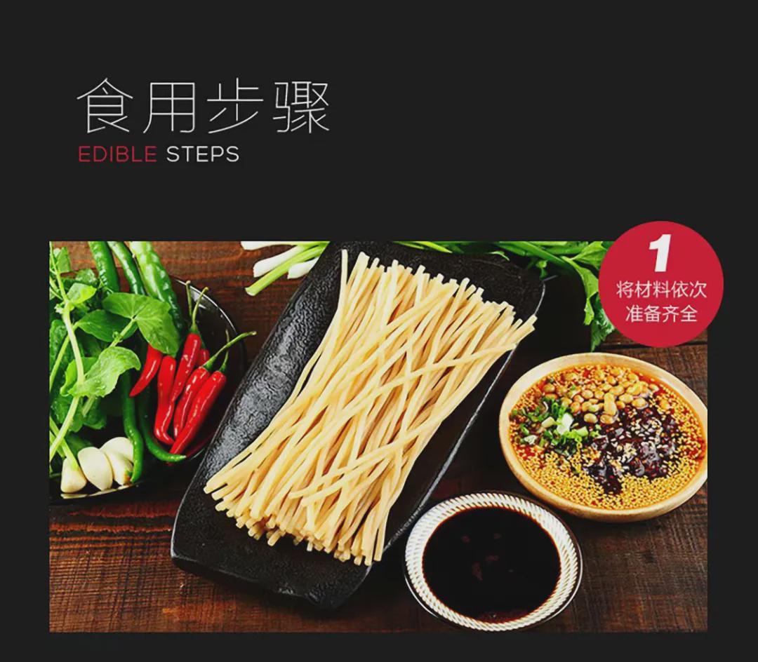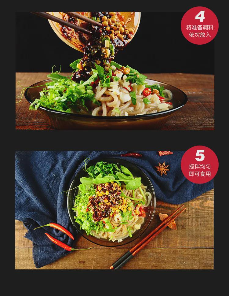 秘制酱包融合香料和红油辣椒,独立包装,一撕二倒三煮四拌,五分钟就能出一道美味,方便又快捷,好吃“一步到胃”........